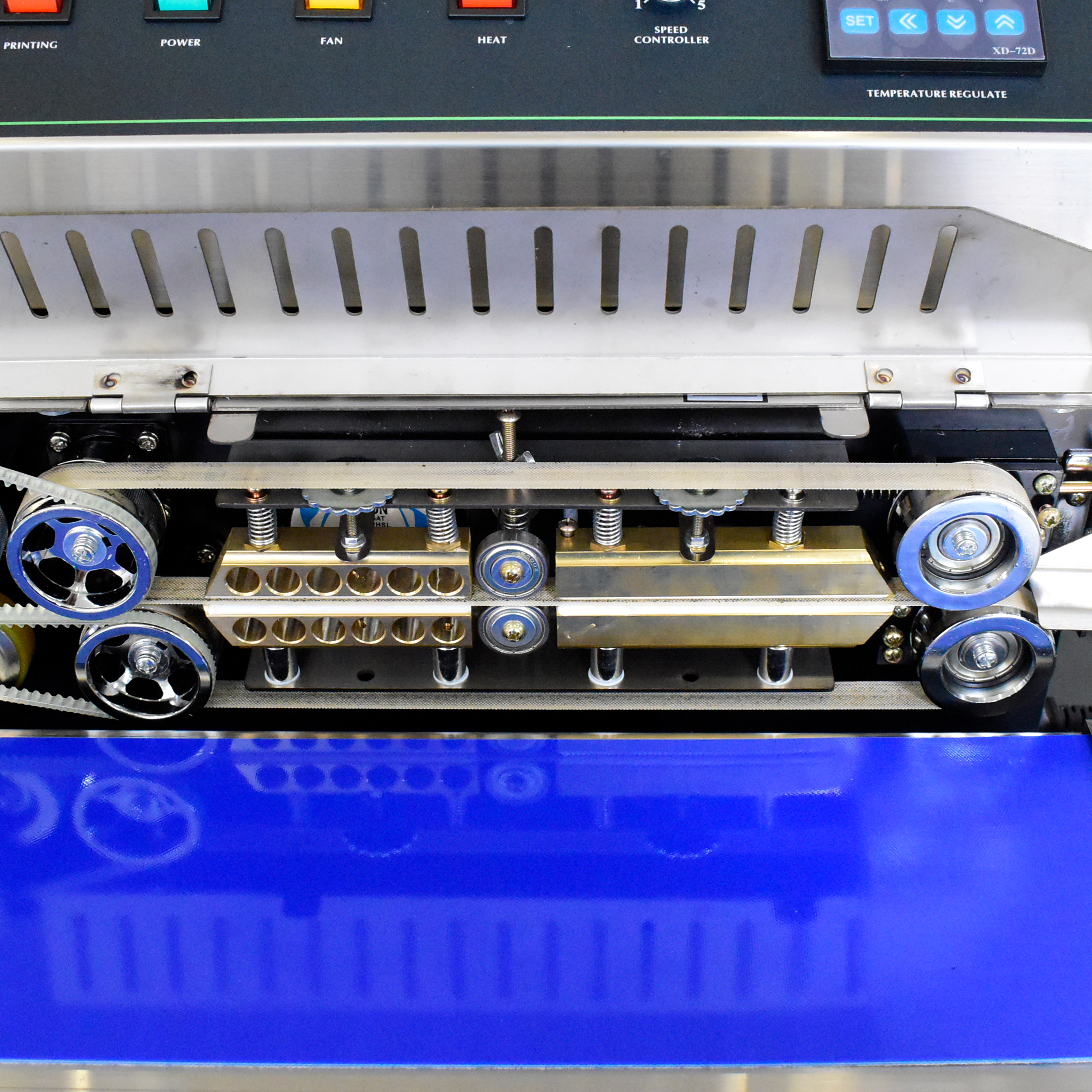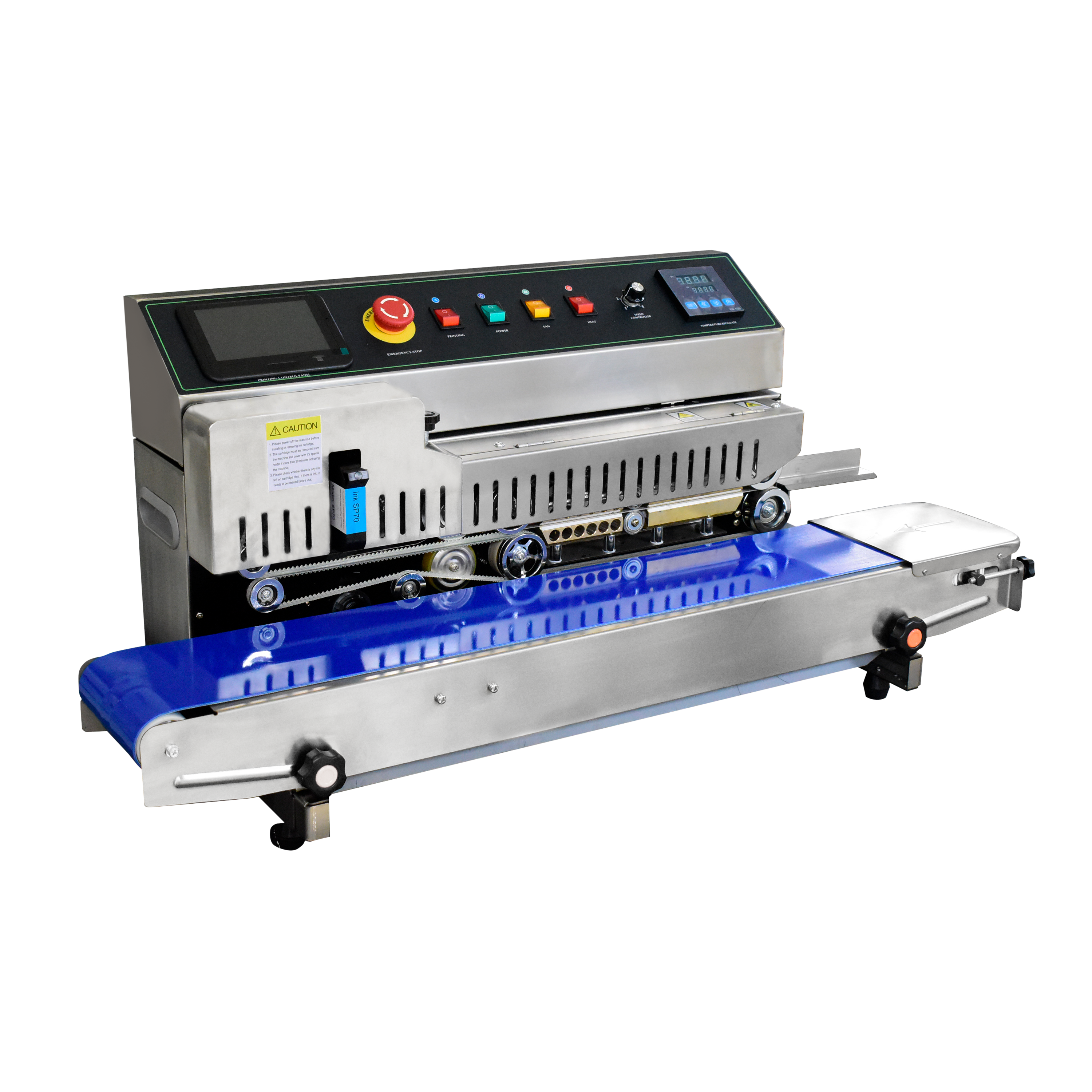Operating the Band Sealer with printer follows a structured process designed for industrial efficiency. First, connect the power supply and ensure proper grounding. Switch on the main power and adjust the temperature controller according to the material and thickness of the bag. Set the sealing speed using the speed adjustment knob, then activate the heating and cooling system. Position the bag mouth evenly on the conveyor table and allow the system to guide it through the heating block, sealing area, and cooling section. For coding, enable the printing switch and set the required parameters, such as character spacing, delay, and voltage, to ensure accurate marking. Adjust the printing wheel pressure to achieve clear print quality. During operation, the bags move automatically through the conveyor system, and sealing with coding is completed in one pass. After use, follow the correct shutdown sequence: turn off the temperature switch, allow the system to cool, and disconnect power.