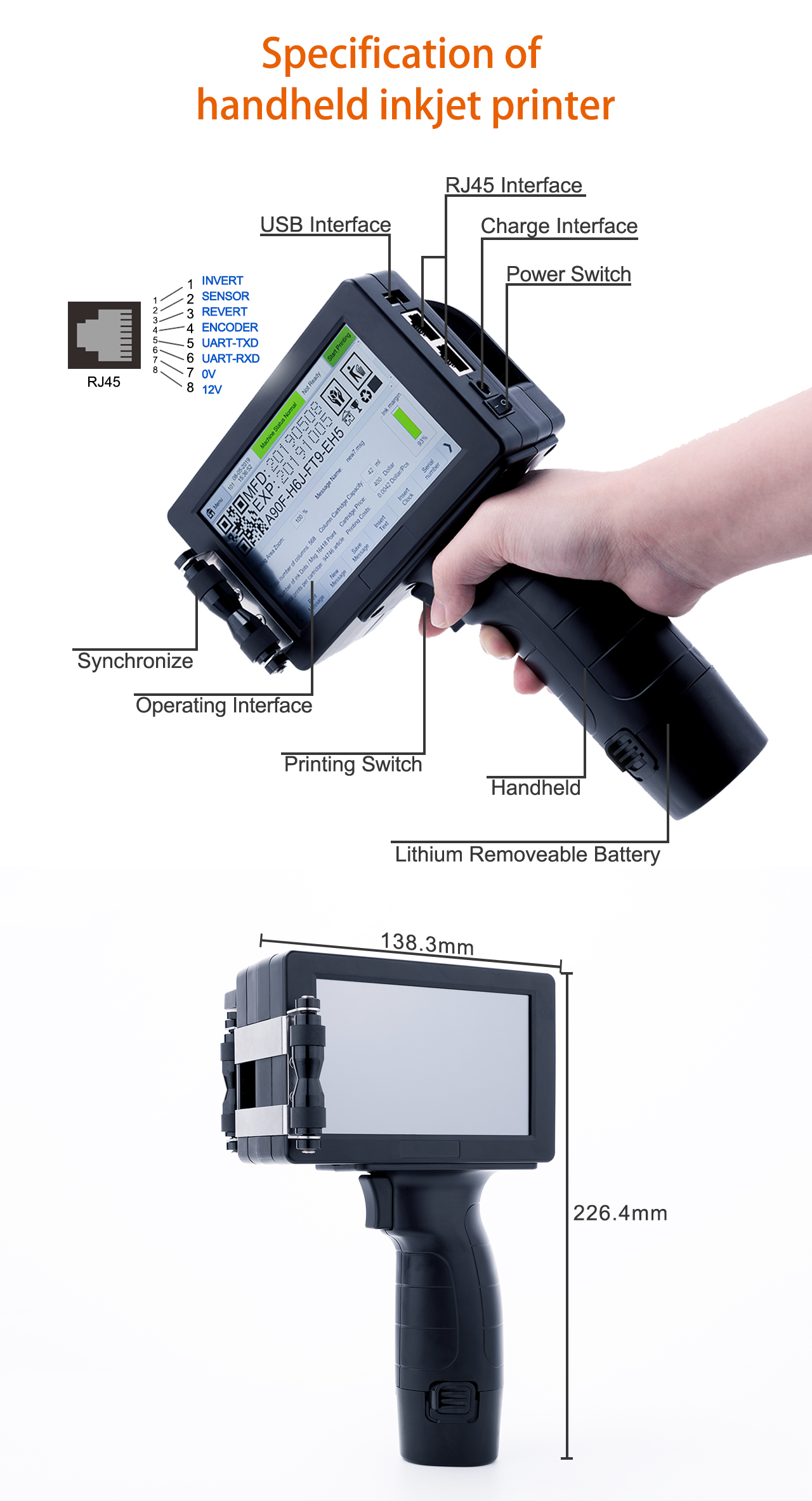 Specifications of GT-100E Handheld thermal inkjet printer