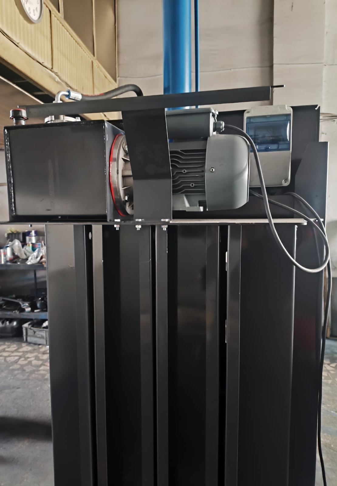 The installment of the vertical baler TONNA10 is fairly simple. Basically, all you need to do is connect the air pressure and plug in the electricity and you are ready to go. The first step after the cardboard baler is installed is to pull the squeezing hammer up, so the space, where you will put waste material, is empty. This can be done simply by moving the handle. Then you need to put the waste material inside the cardboard baler. You can fill the vertical baler with plastic, wood, cardboard, paper, glass, and other waste materials. Fill it to the edge of the Cardboard baler. Then press the handle and the hydraulic hammer will start moving down and squeezing the waster material with pressure. The squeezing process can take a couple of minutes. When the squeezing is over, move the handle and bring the hammer up. Because of the pressure, the material will be squeezed in the bale which needs to be manually bound with a wire or strap. When the bale is bound open the door of the recycling baler and remove the bale by hand or forklift.